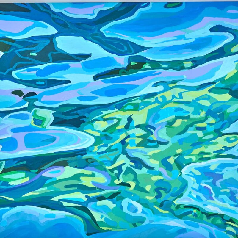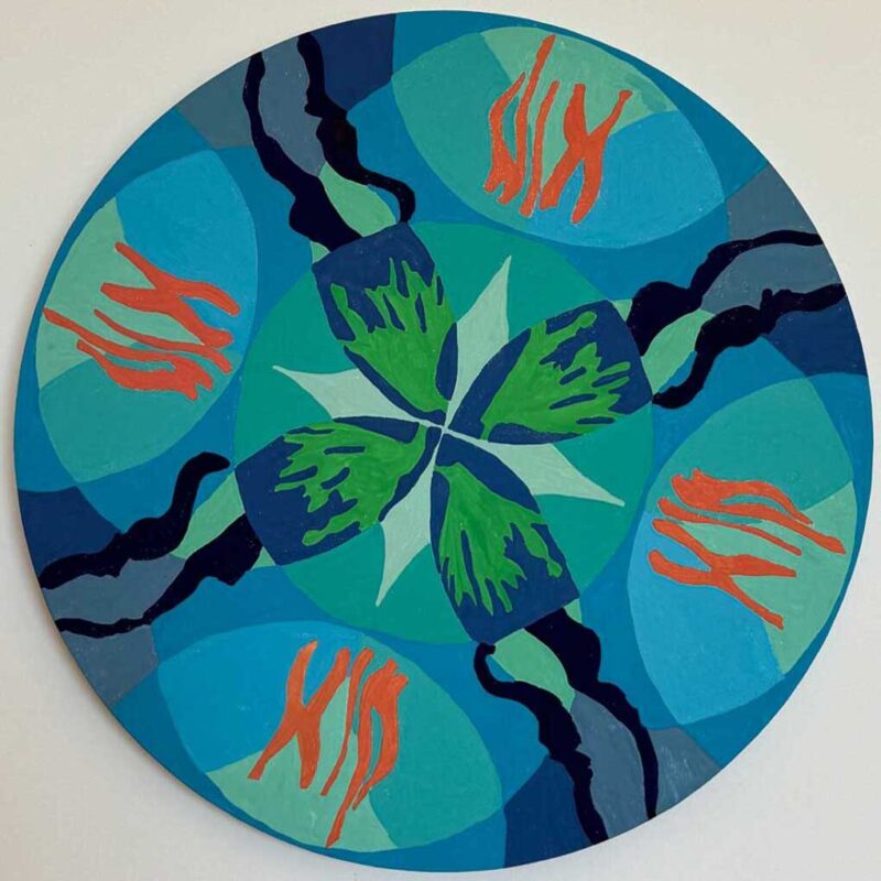Die Kunstschaffende fängt die Schönheit der Natur als Lunge des Mittelmeeres ein. Die Symbolik des Mandalas zielt zunächst auf wenig Sichtbares unter der Wasseroberfläche ab, so dass nur Farben und Formen bestimmte Bereiche der Psyche ansprechen und stimulieren. Symmetrische Bewegungen der Gräser umschliessen ihre Blüten als Mittelpunkt. Das spanische Gras wird nach dem griechischen Gott Poseidon als „Posedonia“ benannt und gilt als schützenswerte Pflanze unter der Biodiversität der Meere. Von der UNESCO als Weltkulturerbe anerkannt, lebt es seit mehr als 100000 Jahren als eines der ältesten Organismen der Meere in unterirdischen Seewiesen und absorbiert CO2.